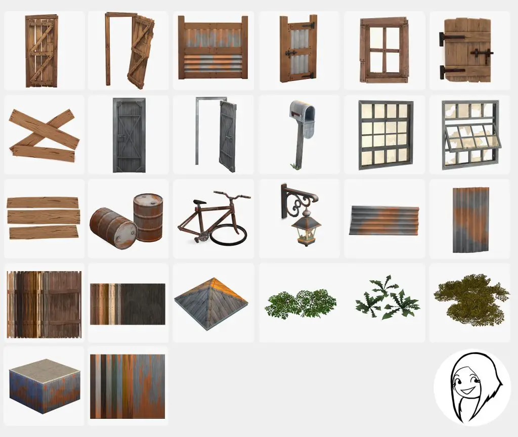- Build: Worn wooden flooring, broken wood planks wallpaper, metal sheet foundation & platform, metal wheet wallpaper, planks roof, fence and assorted gate, metal door (open and closed), metal window (open and closed and with dirty or broken glass), wooden window (frame only, with or without glass), wooden door (open and closed and frame only).