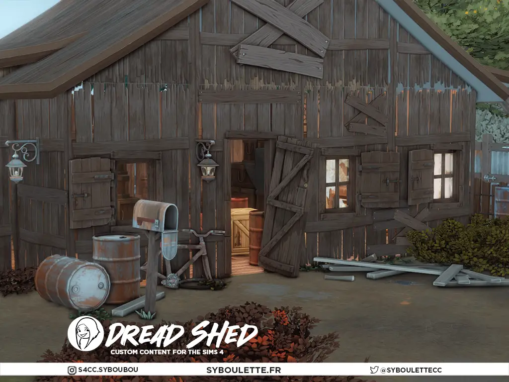 Dread Shed is a cc set made to build the perfect abandoned (or haunted 👻) hideout for your Sims. Whether it’s a forgotten wooden cabin, a rusty metal-sheet warehouse, or a crumbling old shed, this pack is all about worn-out, eerie details. Expect weathered wood, rusty metal, shattered glass windows, and crooked doors—some barely hanging on their hinges.