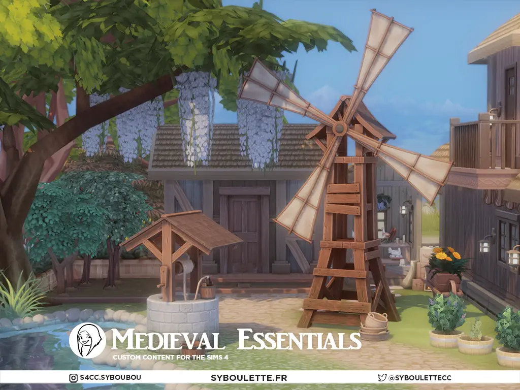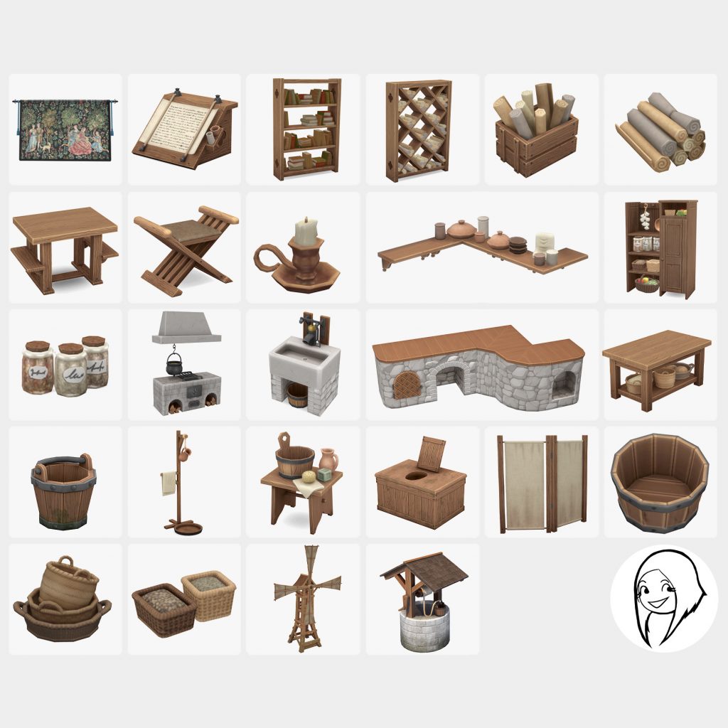 This set contains 28 new items maxis-match and basegame compatible (except for the windmill and well that requires Eco Living DLC). Every functional items works Off-The-Grod escept for the sciptorium.