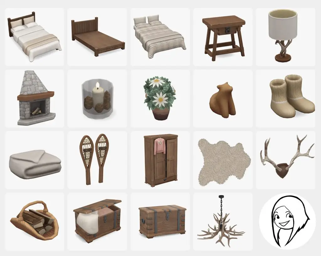 Antler lamps, soft slippers and an edelweiss vase bring mountain charm without the frostbite. The new winter palette (paired with nine cozy wood swatches) lets you build the alpine retreat of your dreams. A snug hideaway for Sims who prefer hot cocoa over holiday hysteria.