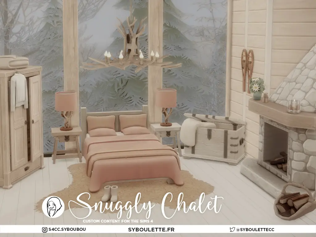 Here’s Snuggly Chalet, a warm and rustic bedroom cc set made for winter days when all you want is a blanket, a fire, and zero festive jingles. Think Annie set vibes reborn in full maxis-match, with a separated mattress double bed, a sturdy dresser, a rustic trunk, and a corner fireplace perfect for brooding dramatically or thawing your toes.