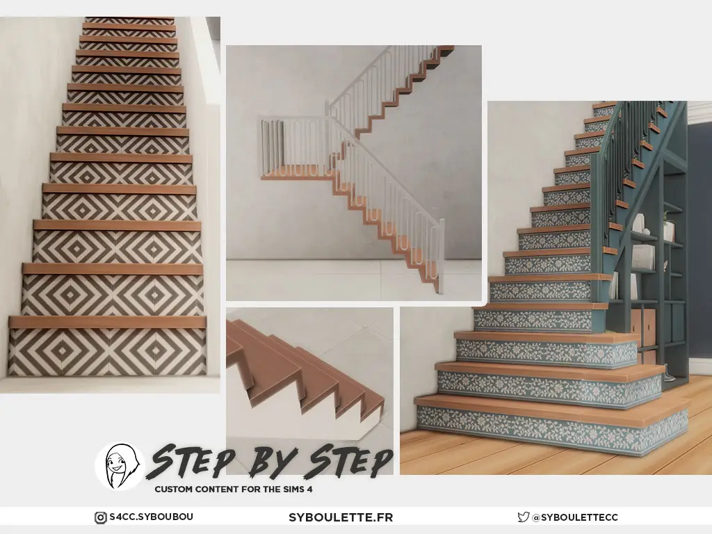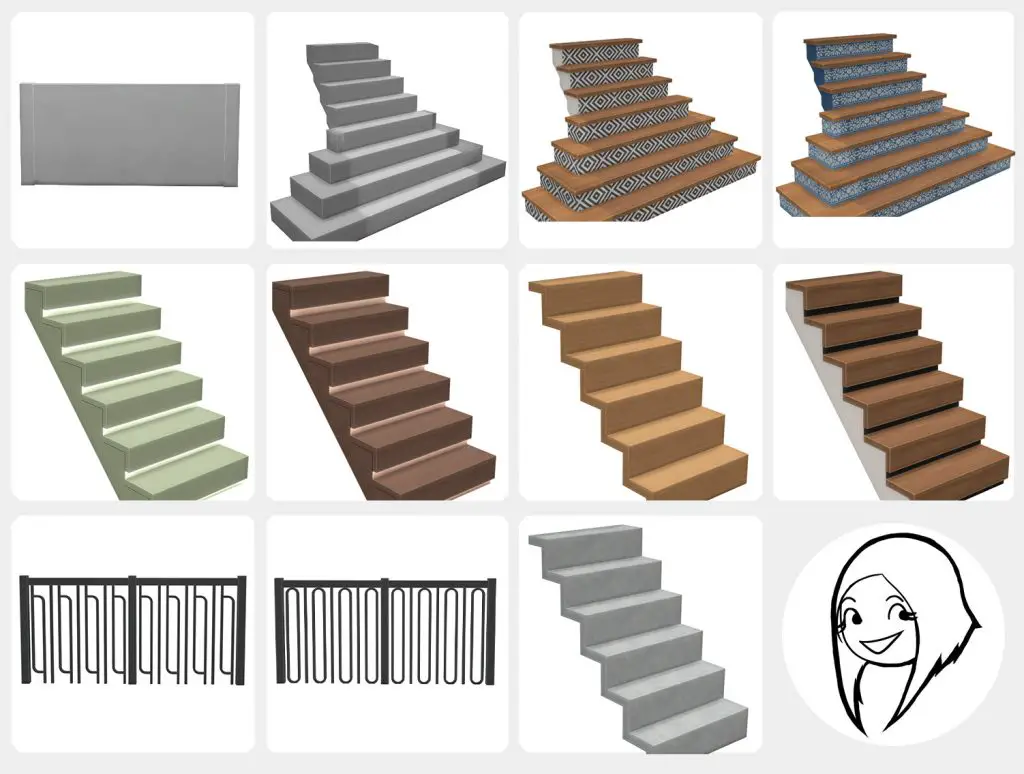 The flared bottom part uses a different shader than the rest of the stairs, so the colors won’t always match perfectly (they can look a bit lighter or darker depending on your lighting). The textures also stretched in a weird way, so most of the time I just tried things over and over until it looked right. Just wanted to be honest about that!